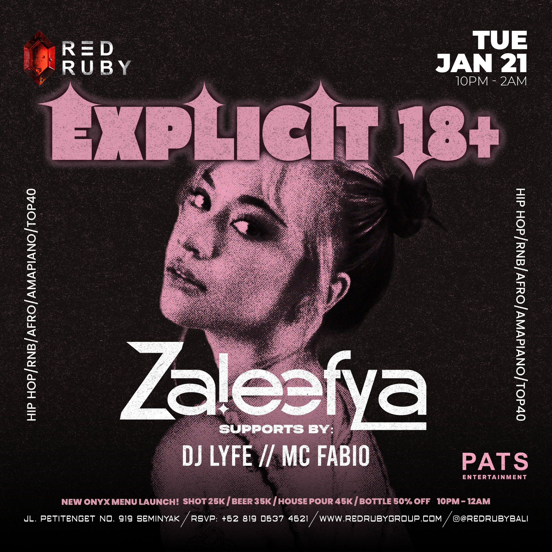 ๐๐๐๐๐๐ ๐๐ by @pats.entertainment | Known for her dynamic blend of house, techno, and bass, @zzaleefya will be bringing her high-energy sets to the Red Ruby stage. Donโt miss out on the chance to experience her unique style and infectious vibe. Letโs dance the night away! ๐ซ