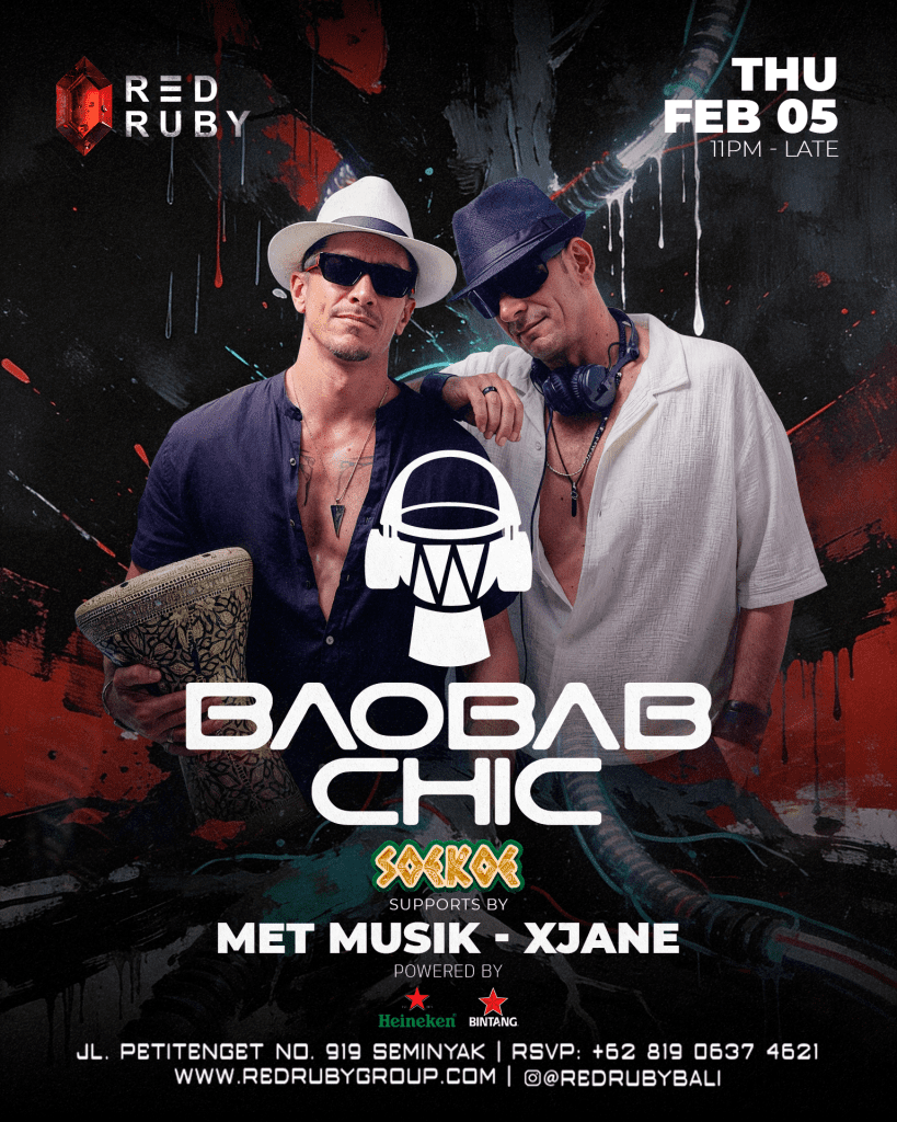 Launched in 2022, @baobab_chic_ has quickly become one of Baliโ€™s standout DJ duos. In a short time, theyโ€™ve already shared the stage with global icons like ๐—ฆ๐—ธ๐—ฟ๐—ถ๐—น๐—น๐—ฒ๐˜…, ๐——๐—ฒ๐—ฎ๐—ฑ๐—บ๐—ฎ๐˜‚๐Ÿฑ, and ๐—ฆ๐—ฝ๐—ฎ๐—ฐ๐—ฒ ๐— ๐—ผ๐˜๐—ถ๐—ผ๐—ป. Blending afro house, deep house, tech house, melodic techno, and tribal vibes, every set is a journey that lights up the dancefloor. ๐Ÿ”ฅ