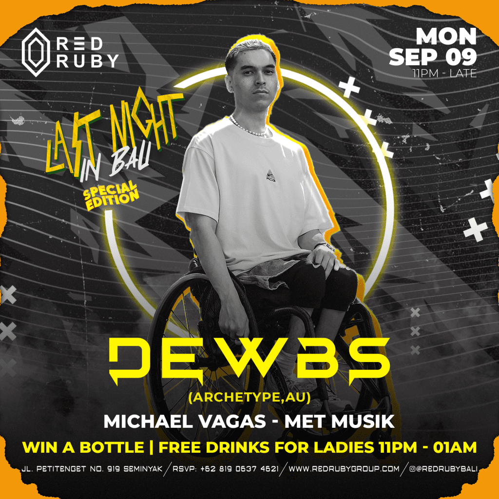 Since getting his first DJ decks at just 12 years old, hidden gem DJ/Producer Dewbs has honed his technique to become an accomplished selector. The West Australian based artist specialises in authentic underground electronic sounds of Garage, Techno, Trance & House.Catch @andrew.dewbs spinning his unique vibe only at Red Ruby Bali!
