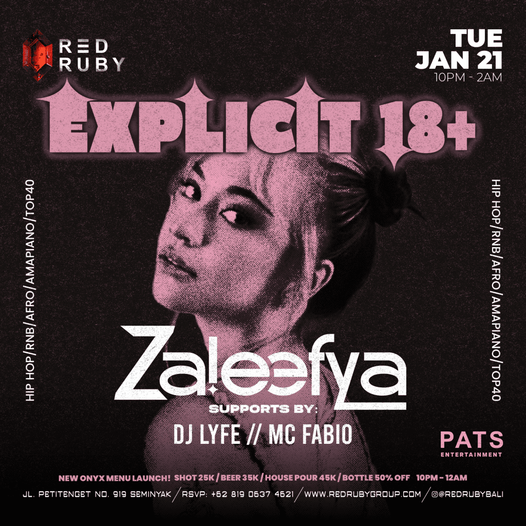 ๐™๐€๐‹๐„๐„๐…๐˜๐€ by @pats.entertainment | Known for her dynamic blend of house, techno, and bass, @zzaleefya will be bringing her high-energy sets to the Red Ruby stage. Donโ€™t miss out on the chance to experience her unique style and infectious vibe. Letโ€™s dance the night away! ๐Ÿ’ซ